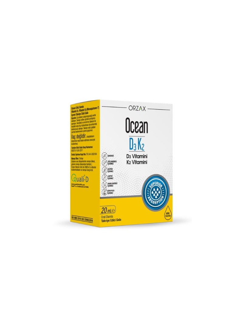 D vitamini, vücutta önemli görevleri olan yağda çözünen bir vitamindir. Ocean Vitamin D3 ürünlerinde koruyucu katkı maddesi, renklendirici, tatlandırıcı, yapay aroma verici ve ilave şeker içermez. Yetişkinler için güvenli kullanım sunar. Ocean Vitamin D3 ürünlerinde koruyucu ve taşıyıcı olarak hakiki zeytinyağı kullanılmaktadır. Damla formu ile kolay kullanım imkânı sunar.