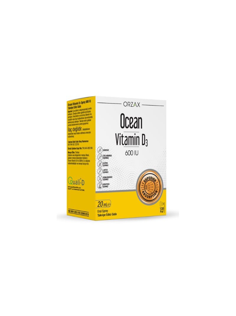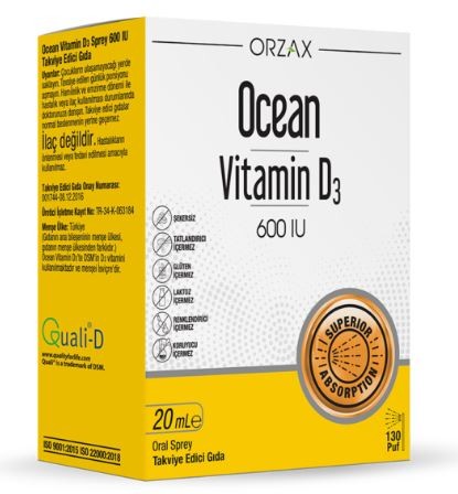 D vitamini, vücutta önemli görevleri olan yağda çözünen bir vitamindir. Ocean Vitamin D3 ürünlerinde koruyucu katkı maddesi, renklendirici, tatlandırıcı, yapay aroma verici ve ilave şeker içermez. Yetişkinler için güvenli kullanım sunar. Ocean Vitamin D3 ürünlerinde taşıyıcı ve koruyucu olarak hakiki zeytinyağı kullanılmaktadır. Sprey formu ile kolay kullanım imkânı sunar.