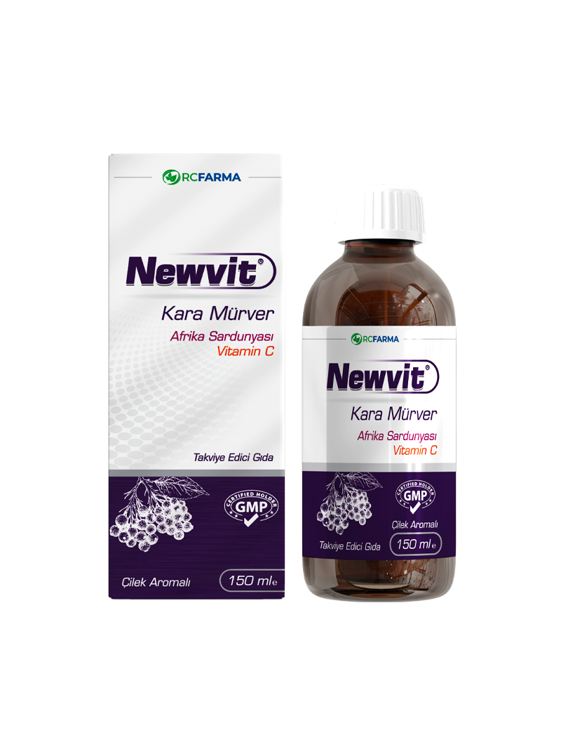 Newvit Kara Mürver, Afrika Sardunyası 150 ml; Sambucus Nigra (Kara Mürver) Ekstraktı, Vitamin C ,Pelargonium Sidoides (Afrika Sardunyası) ,Çinko (Glukonat) içerir.